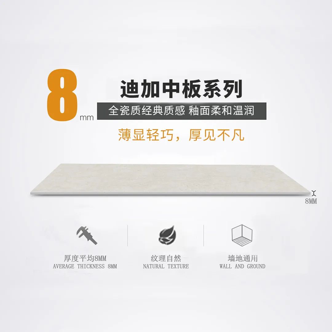 迪加瓷质中板系列集墙砖、地砖、薄板等诸多品类优势及装饰效果于一体,将成为行业的一股新锐力量,进一步冲击瓷片的市场份额,重塑产品品类格局。